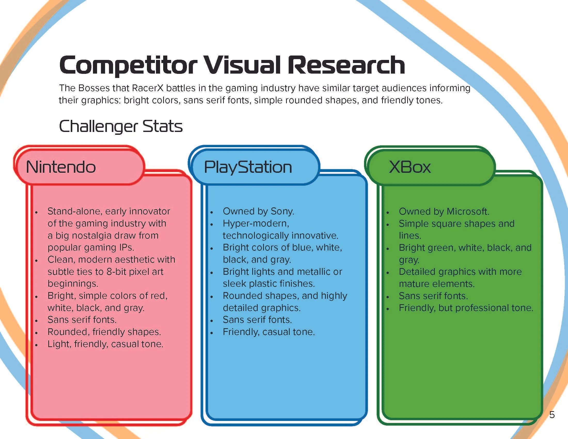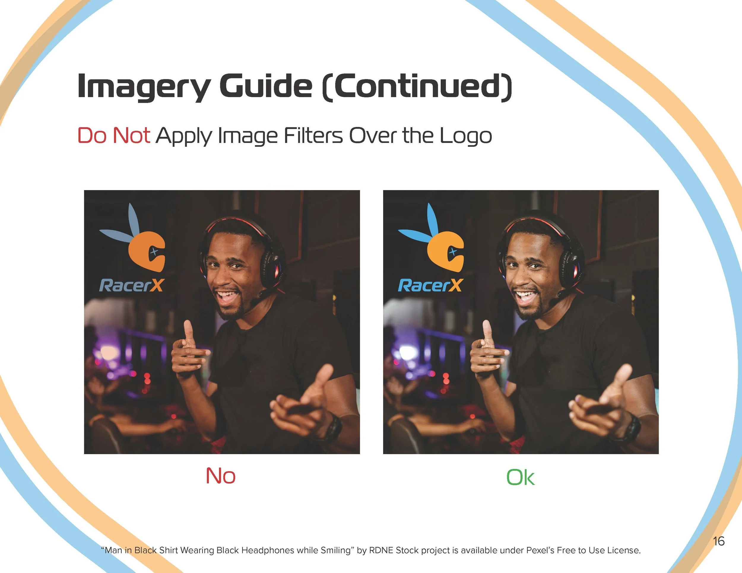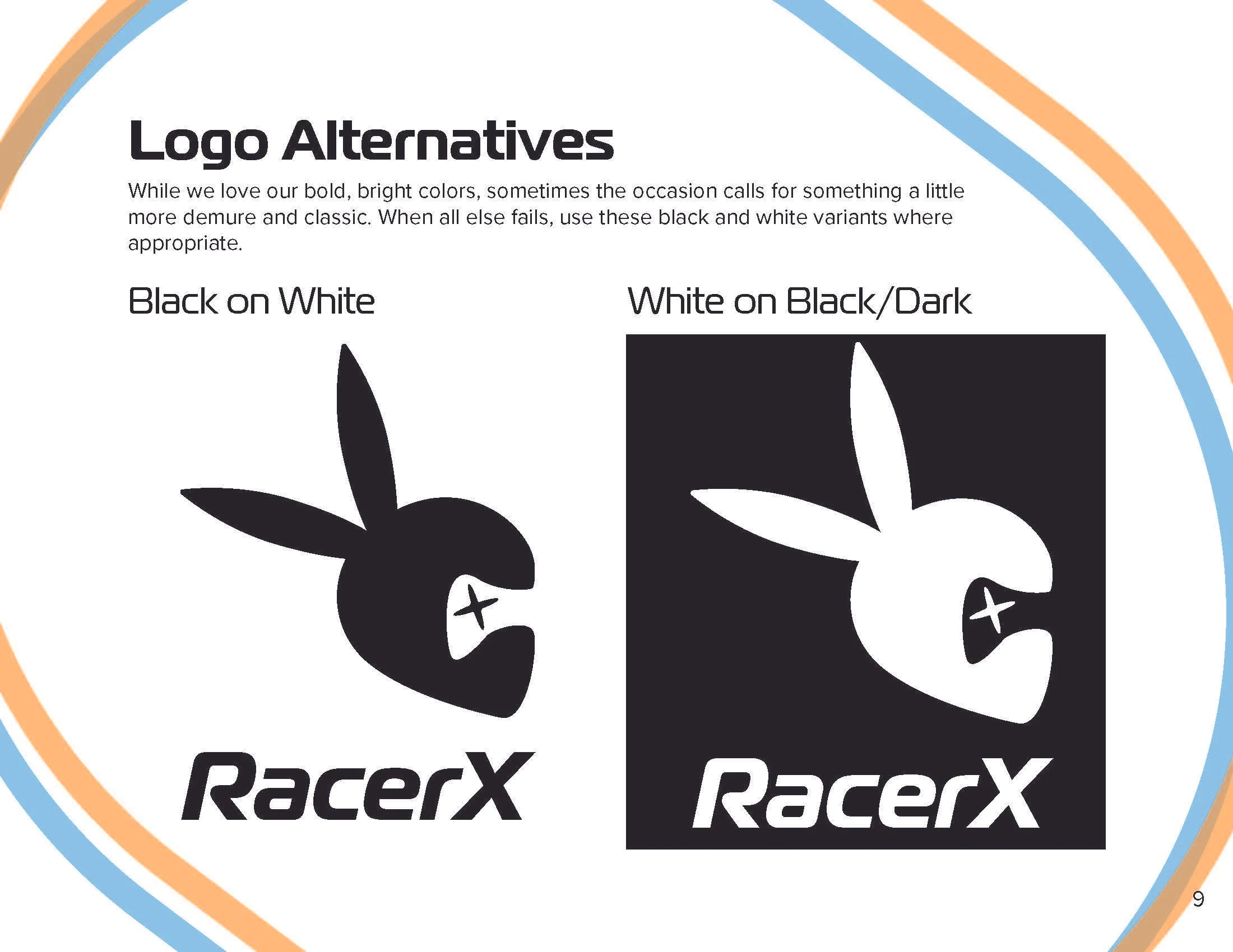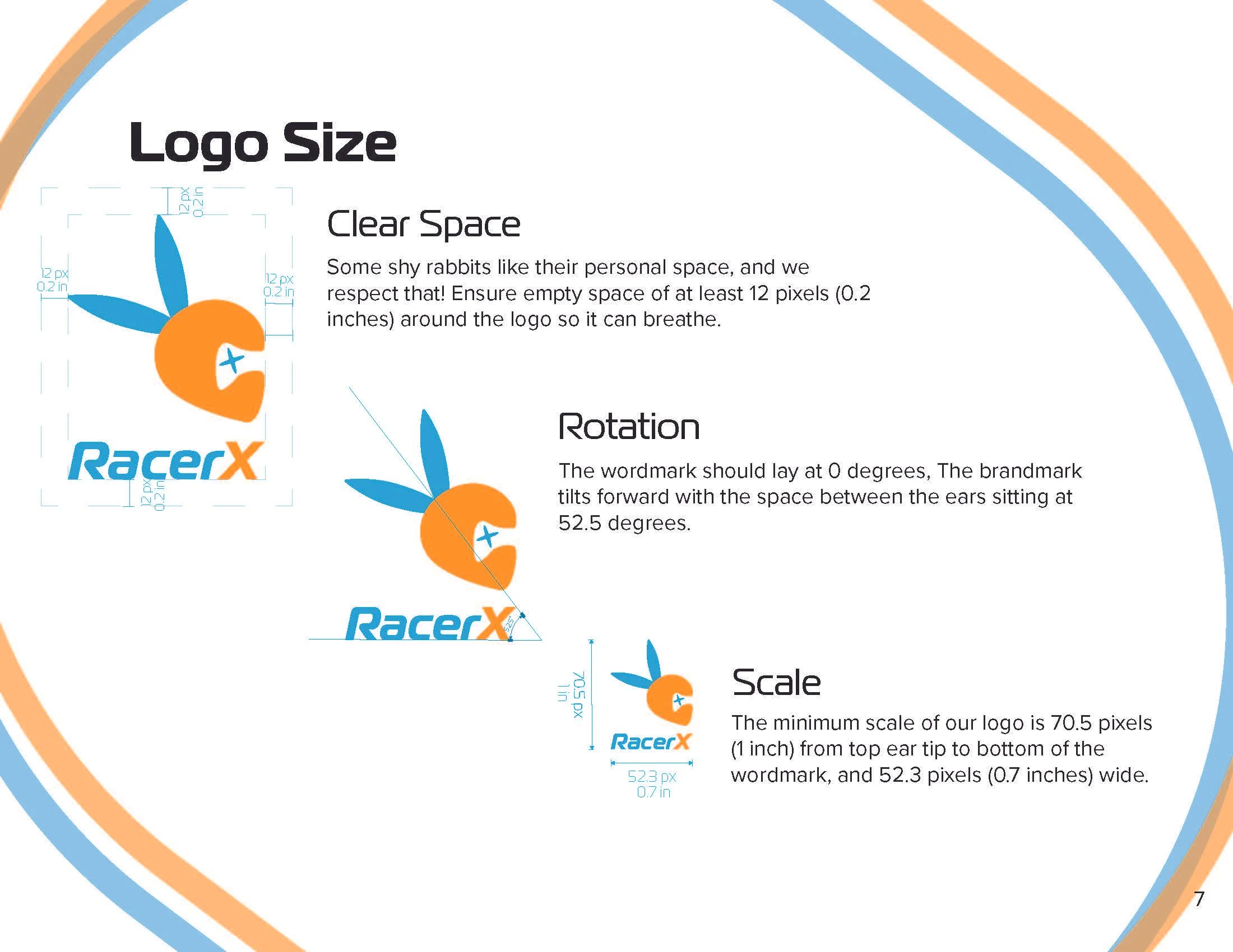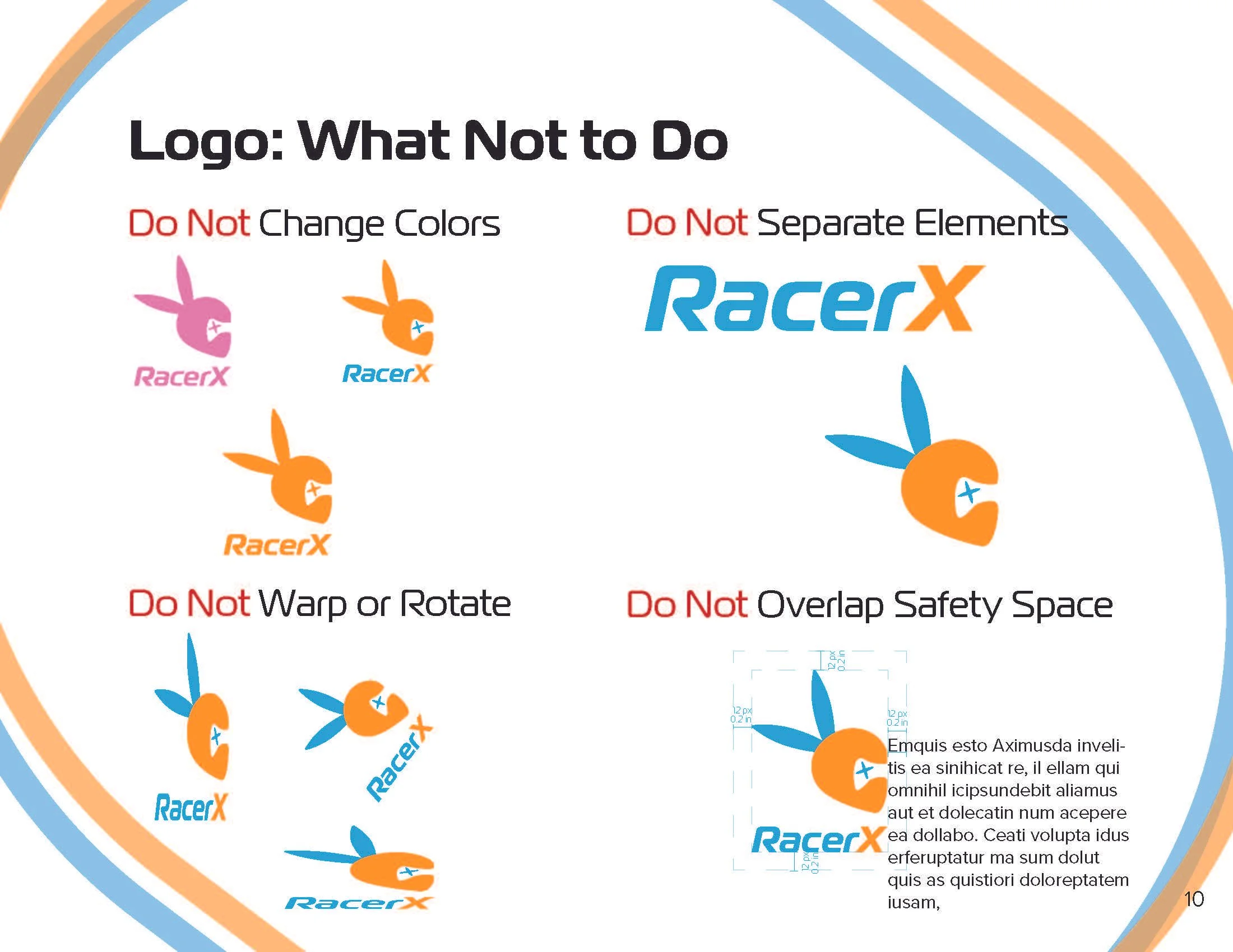 The final branding guide for RacerX outlines the client’s branding elements supported by customer and industry research. The final design of the logo is presented with color variants. Instructions for proper use and placement of the elements with visual demonstrations of acceptable and unacceptable use are included to ensure consistent brand imaging and messaging across all channels.